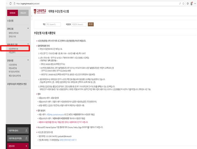 - 인터넷 수강신청 전용 URL(http://sugang.korea.ac.kr/graduate)에 접속하여 수강신청